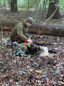 Weiter ging es mit der Kaninchenschleppe. Die Richter brauchten nur 2 Schleppen ziehen, da nur die Border Terrier Hündin und der Deutsch Kurzhaar Rüde für die gesamte BrP gemeldet waren. Die beiden Vierläufer hatten keinen Schwierigkeiten, die Schleppe auszuarbeiten, das Kaninchen zu finden und natürlich auch zu bringen und korrekt auszugeben. Kein Problem für dies beiden Hunde, obwohl die Schleppenarbeit unter erschwerten Bedingungen gearbeitet werden musste. Ein starker Damhirsch wechselte mehrmals von Abteil zu Abteil. Ein toller Anblick!