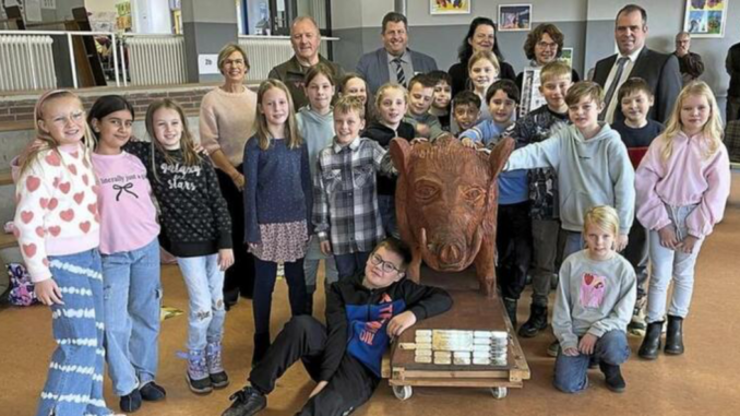 Uesen – „Axel“, ein lebensgroßer Keiler aus Holz, wird für ein Jahr die Grundschule Uesen zieren. Und das haben sich die Schülerinnen und Schüler redlich verdient. Denn