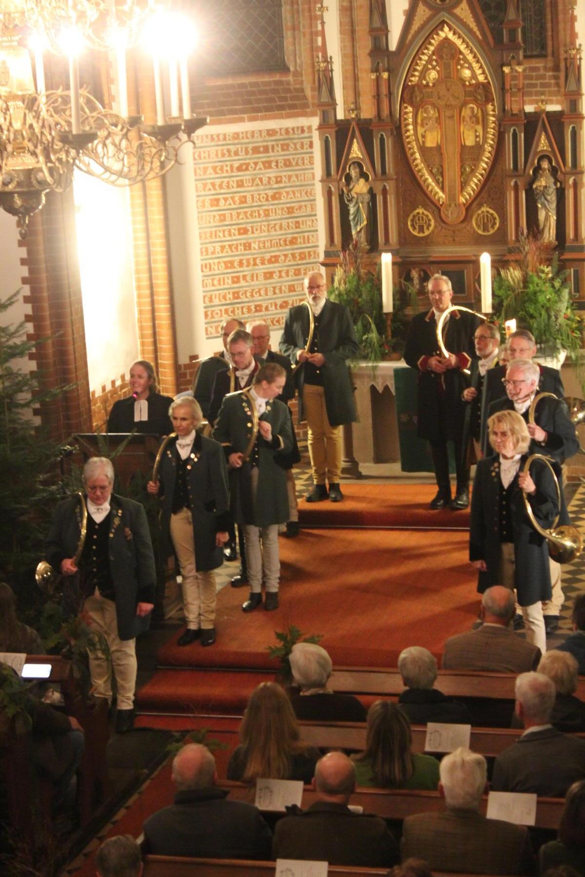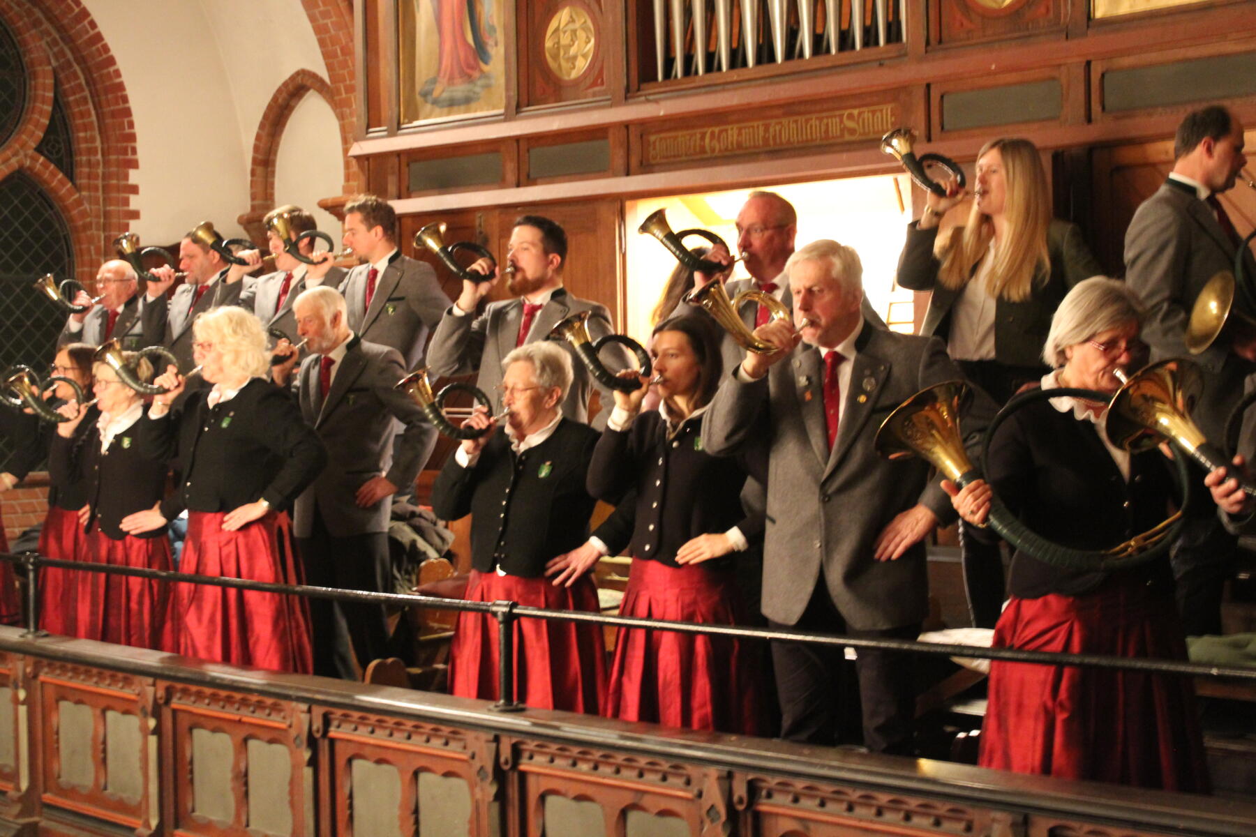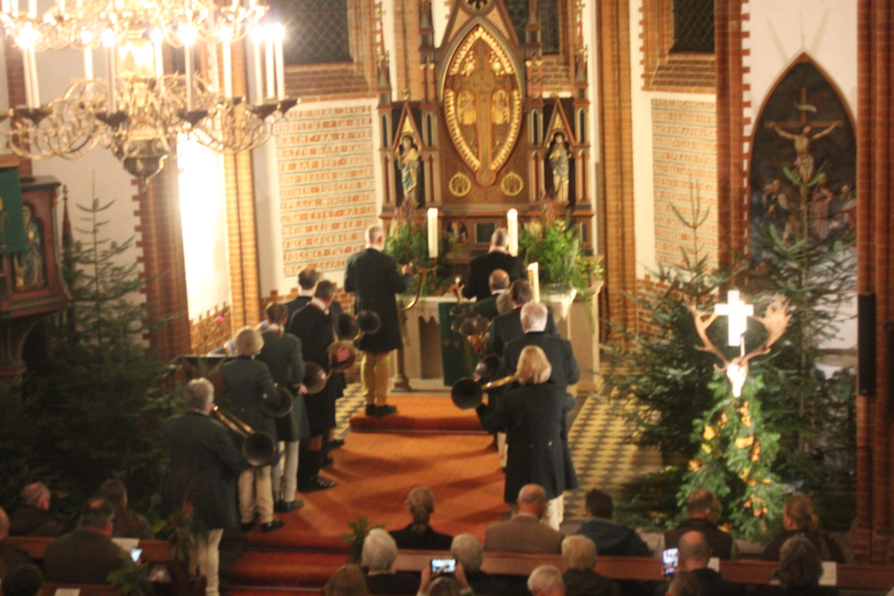 festlich geschmückt. Bereits vor Beginn der Messe unterhielten die Bläsergruppen Allerort und Fischerhunde-West die Gäste mit jagdlichen Signalen und Bläserstücken. Unter den festlichen Klängen der „Begrüßung“, geblasen vom Bläsercorps der Jägerschaft Verden, zogen Pastorin Merle Oswich und die Bläsergruppe „BienAller“ in die Kirche ein. Pastorin Oswich begrüßte die Gemeinde und zeigte sich erfreut über die große Resonanz: „Fast so voll wie an Weihnachten“, sagte sie laut einer Mitteilung an die Presse angesichts der mehr als 300 Besucher.