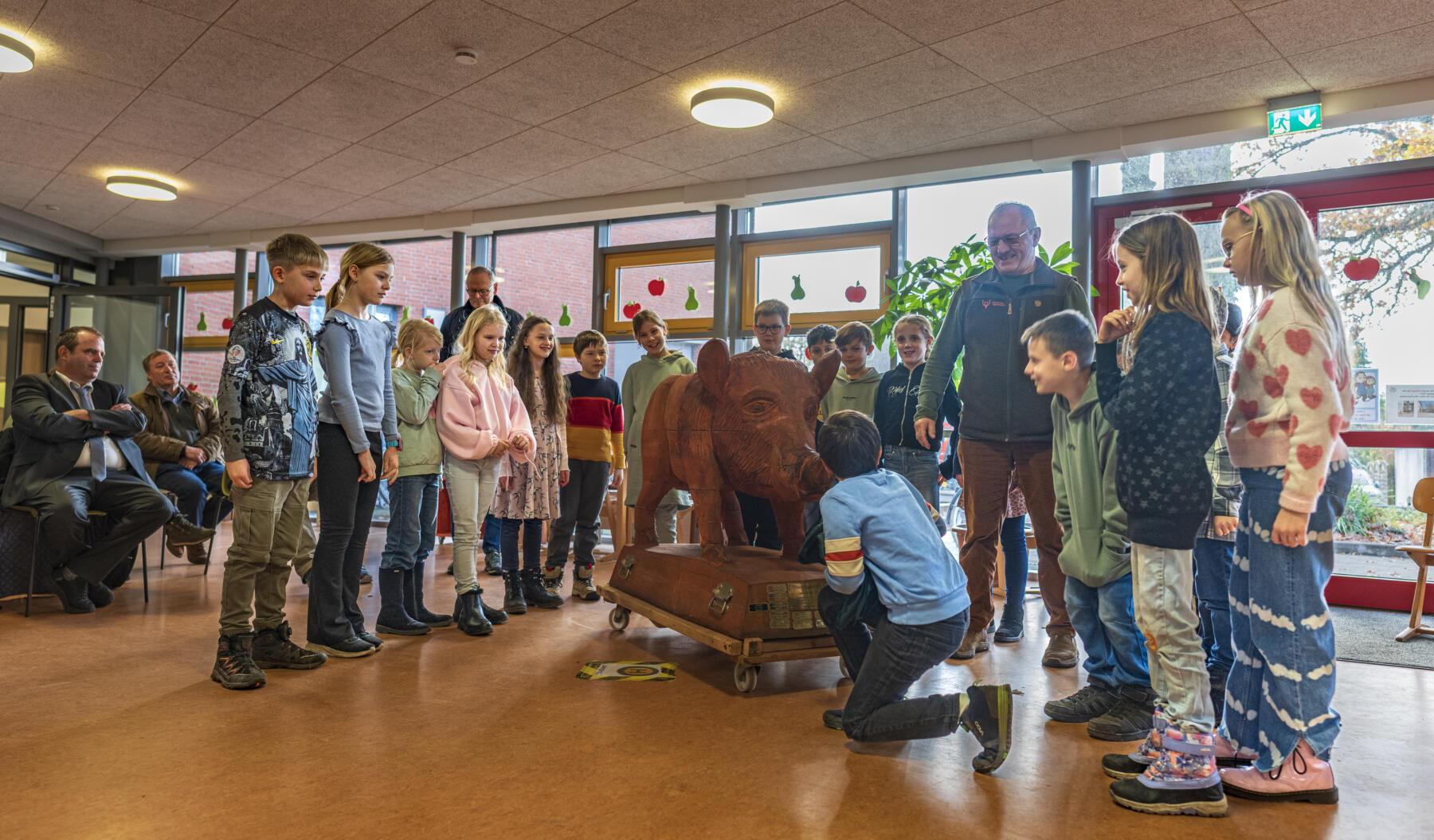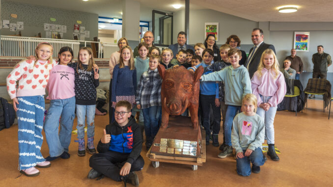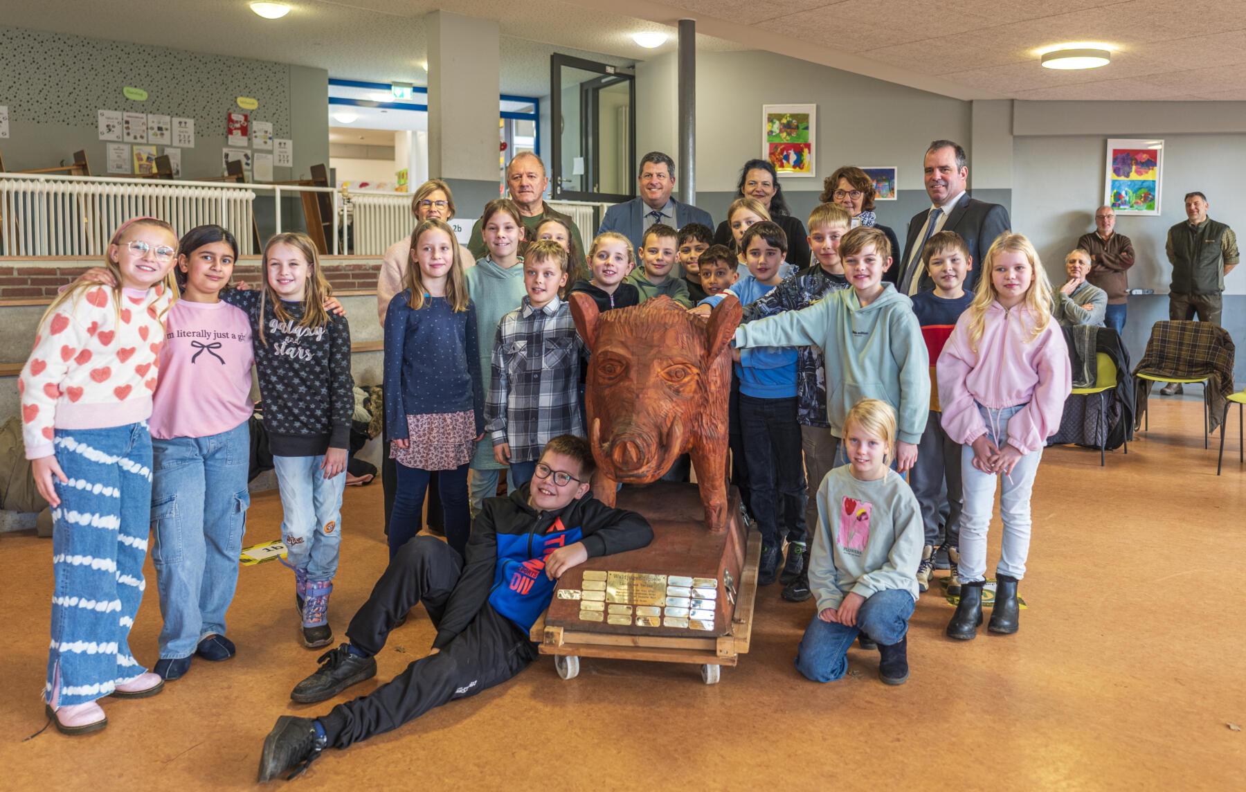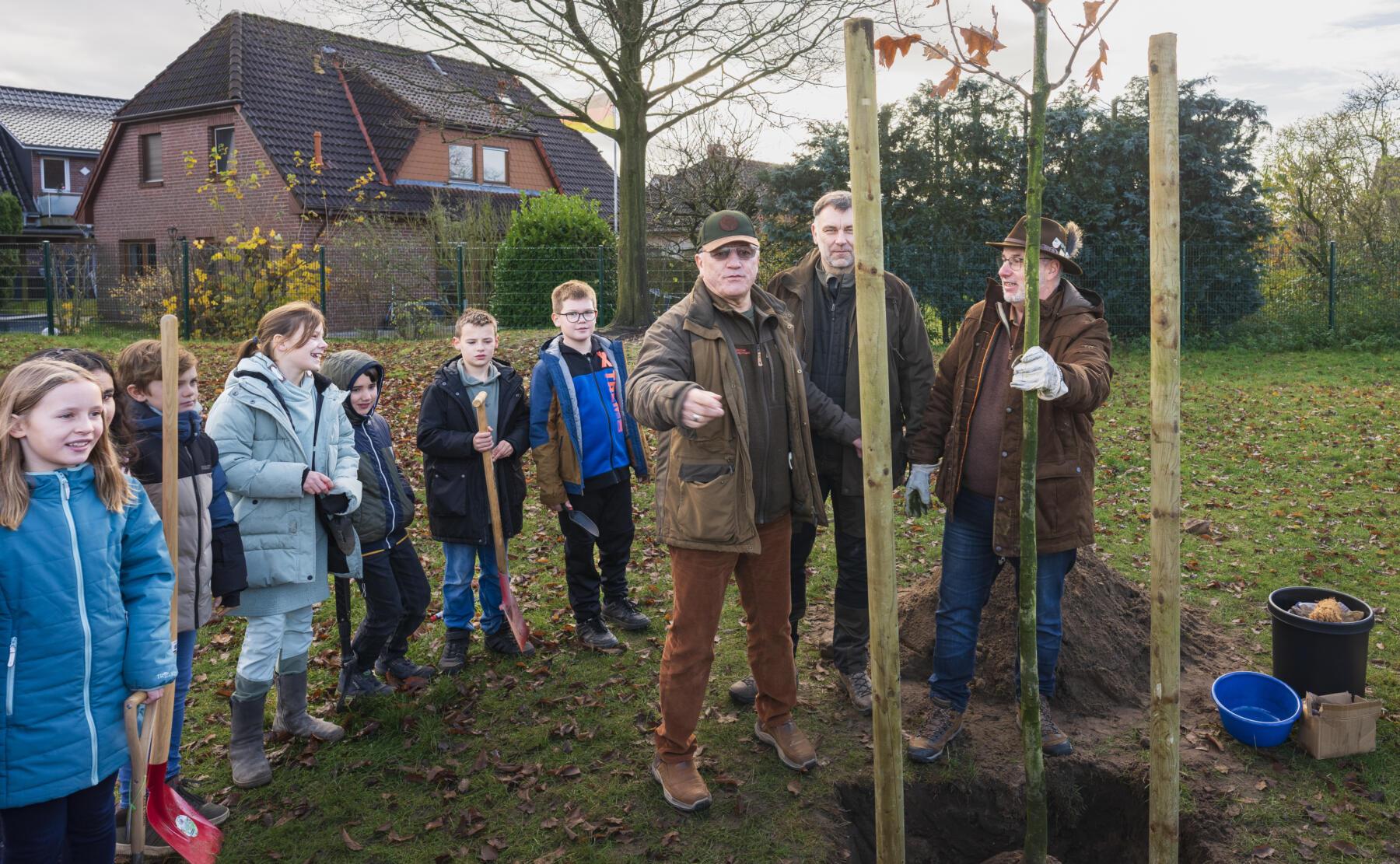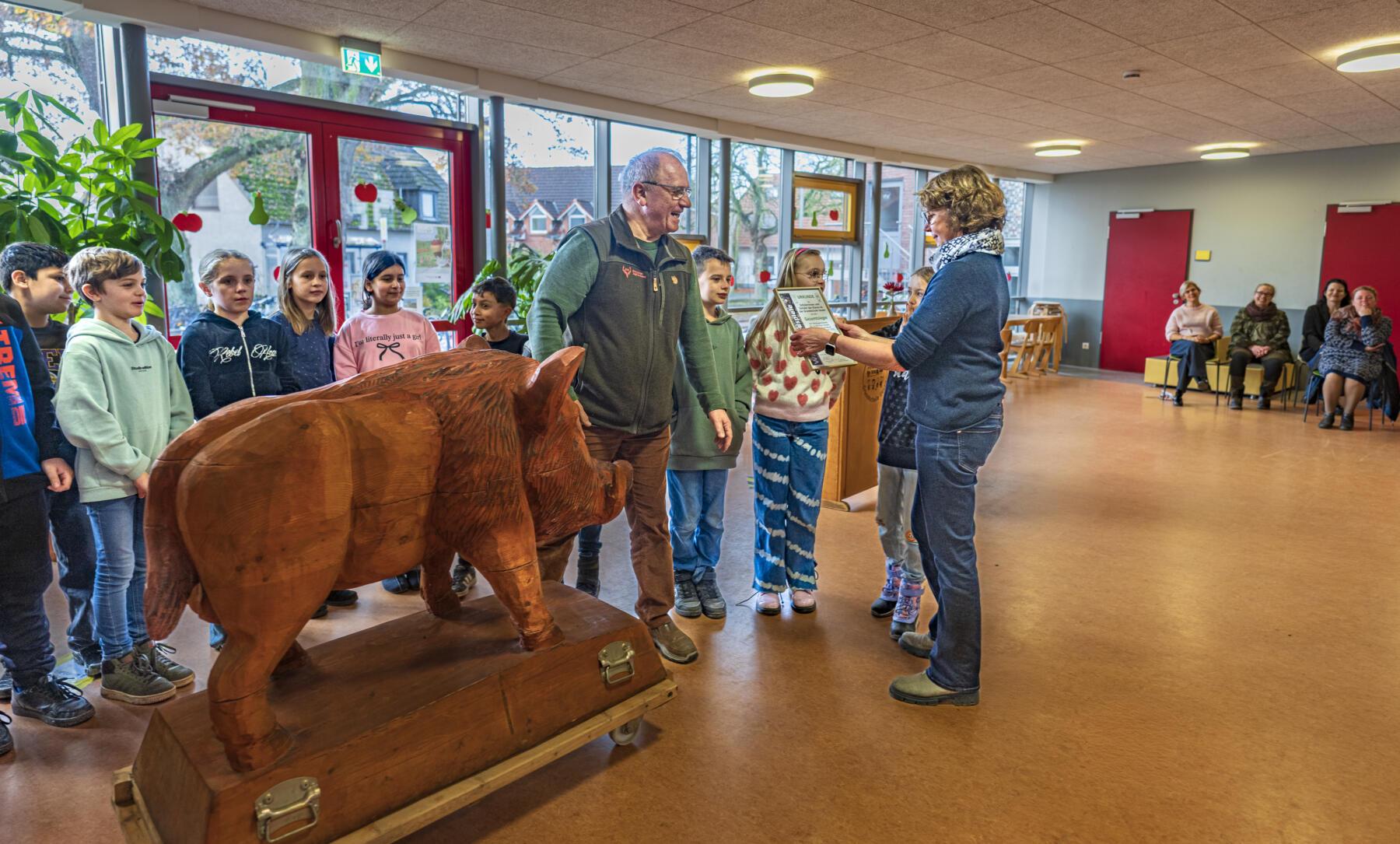 Im Rahmen eines bunten Programms mit wunderbaren und sehr persönlichen Vorträgen der Schülerinnen und Schüler, überreichten der erste Stadtrat Daniel Moos, in Vertretung für Bürgermeister Rainer Ditzfeld, Landrat Peter Bohlmann als Schirmherr und Jürgen Luttmann für die Organisatoren, Pokal und Urkunde an die 4a. Der Pokal ist der lebensgroße Holzkeiler Axel, der bis zum nächsten Jahr einen Platz in der Aula haben wird. Im Anschluss wurde zusammen mit den Schülerinnen und Schülern der Baum des Jahres, eine Roteiche, im Schulgarten gepflanzt
