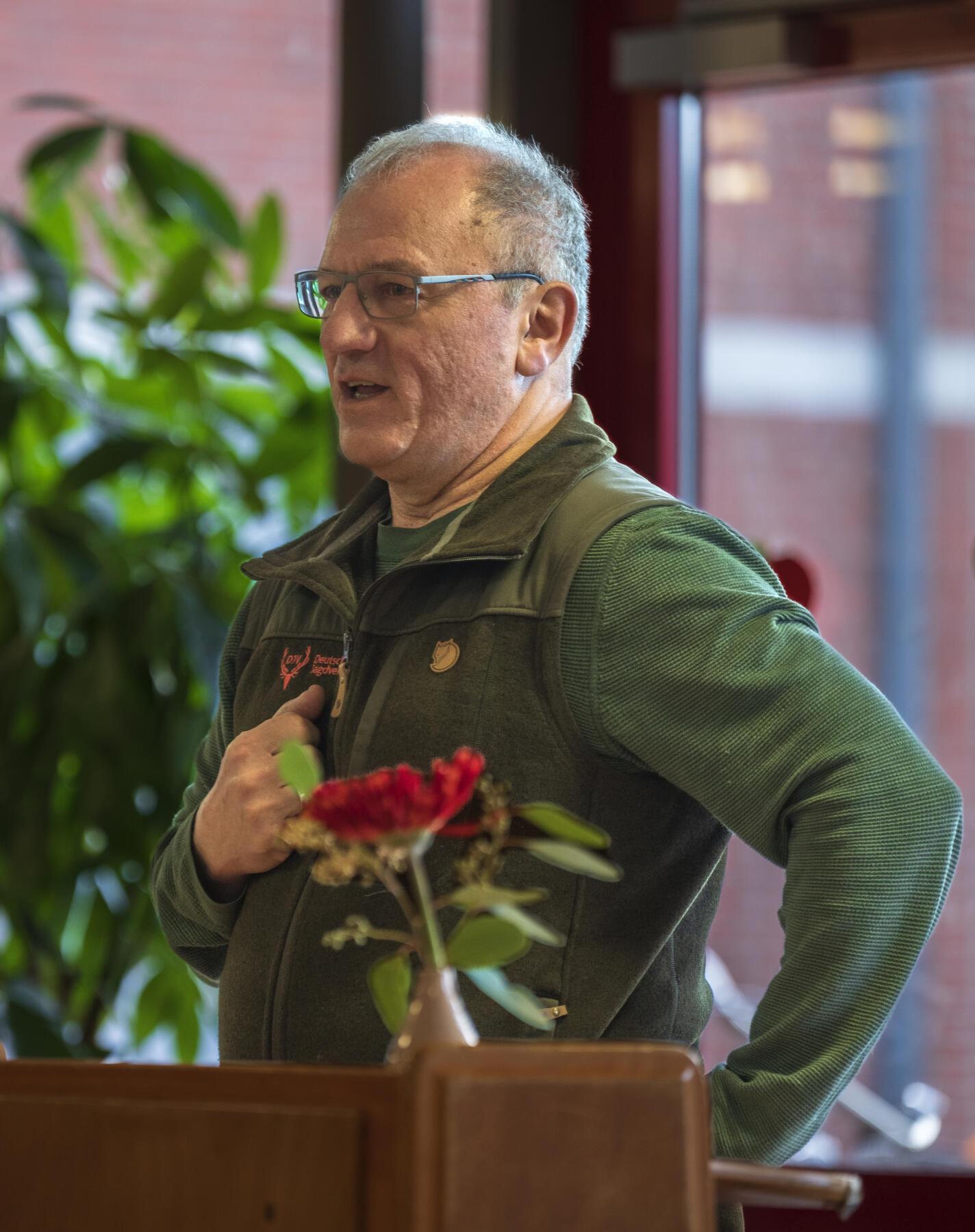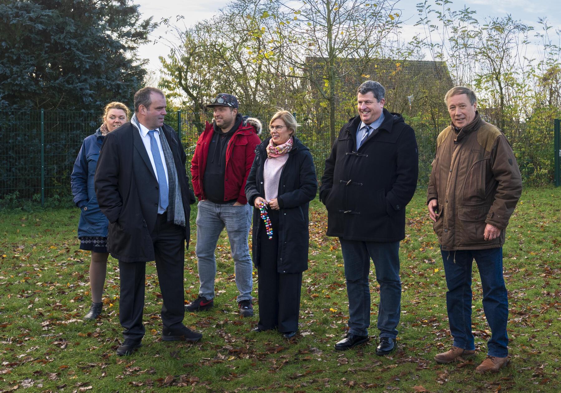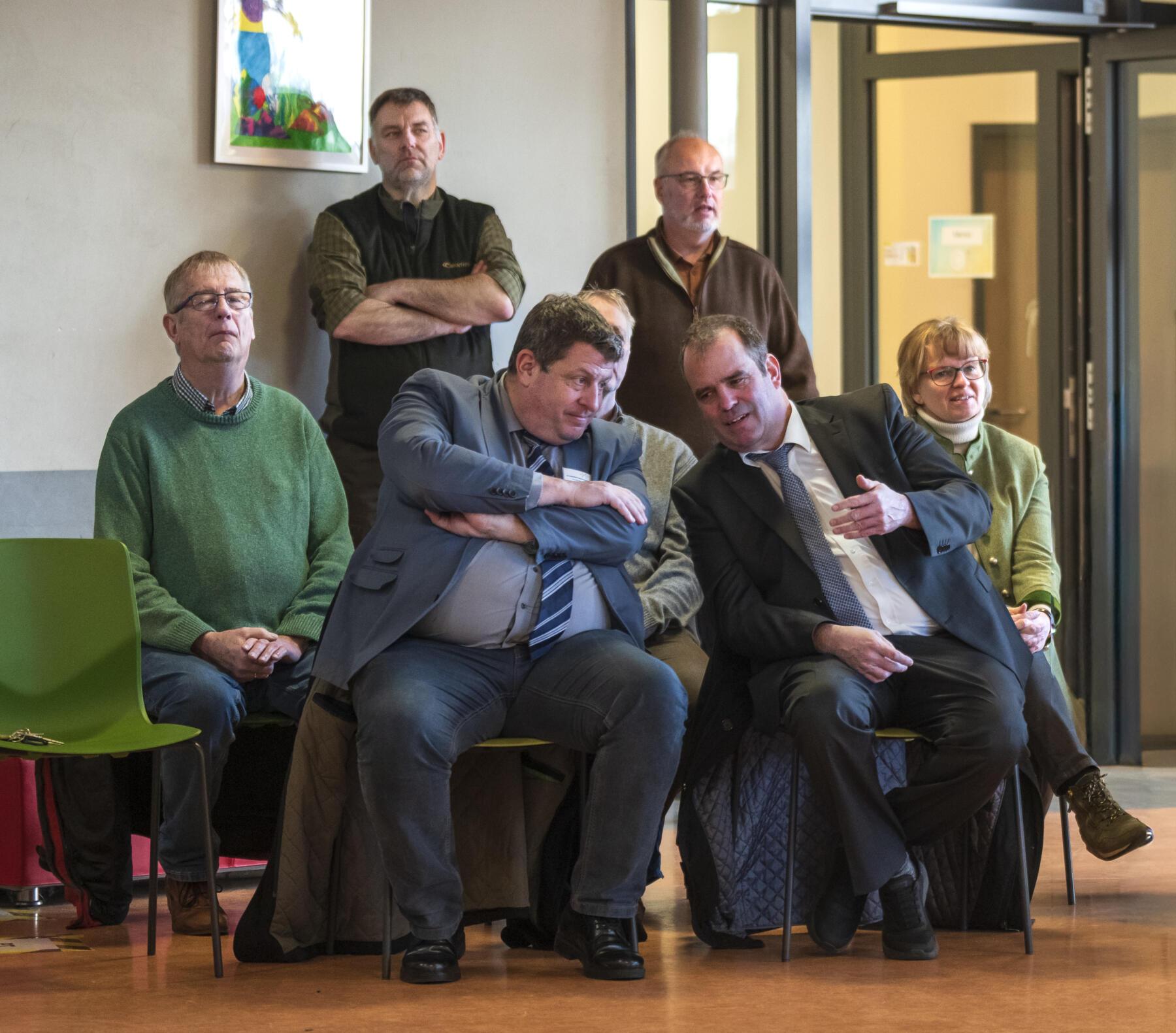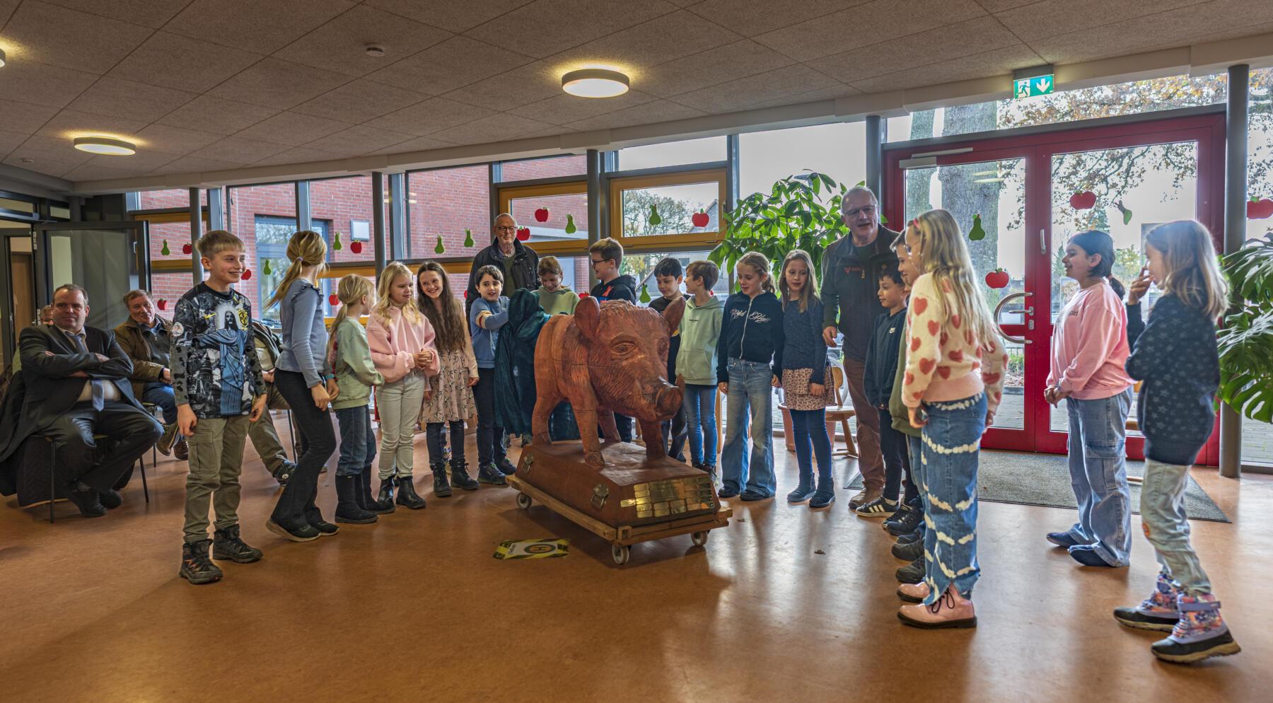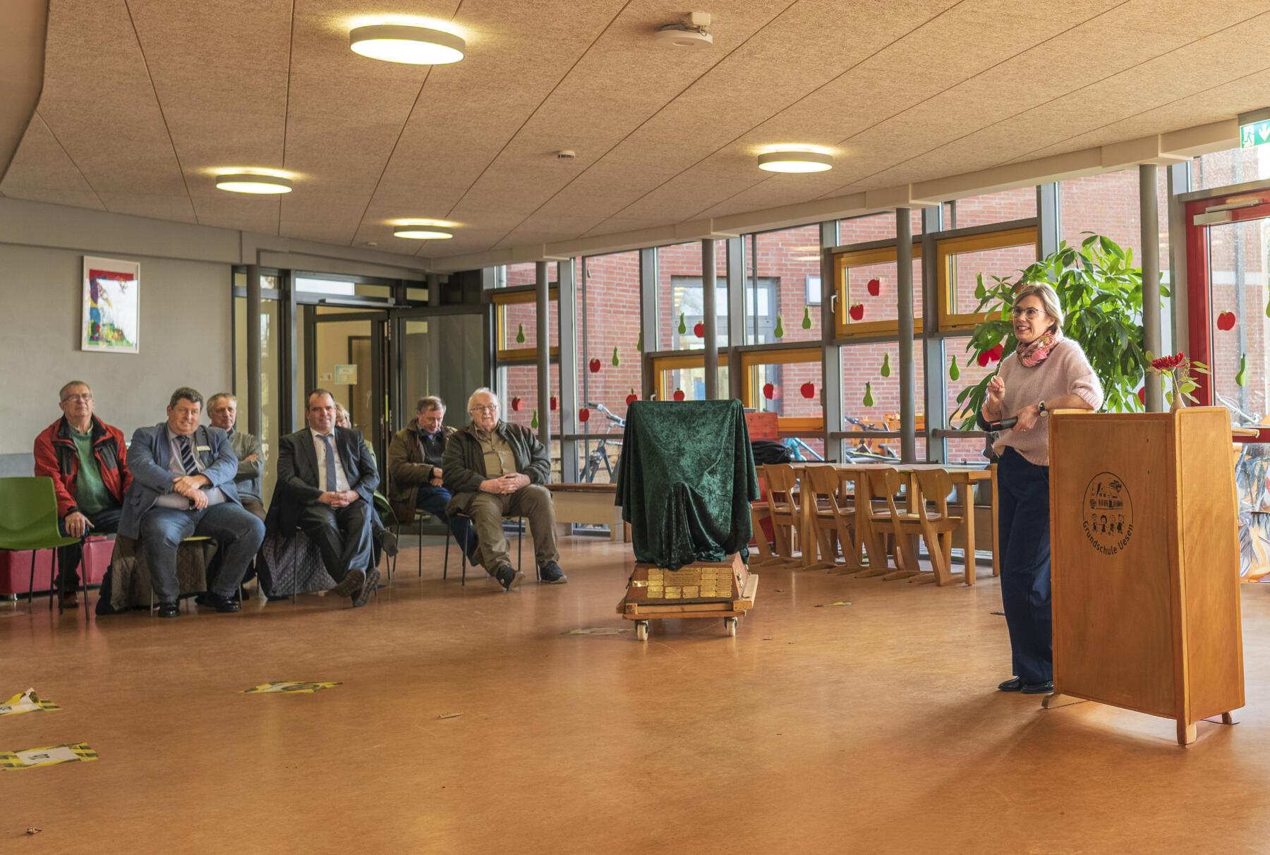 Im Rahmen eines bunten Programms mit wunderbaren und sehr persönlichen Vorträgen der Schülerinnen und Schüler, überreichten der erste Stadtrat Daniel Moos, in Vertretung für Bürgermeister Rainer Ditzfeld, Landrat Peter Bohlmann als Schirmherr und Jürgen Luttmann für die Organisatoren, Pokal und Urkunde an die 4a. Der Pokal ist der lebensgroße Holzkeiler Axel, der bis zum nächsten Jahr einen Platz in der Aula haben wird. Im Anschluss wurde zusammen mit den Schülerinnen und Schülern der Baum des Jahres, eine Roteiche, im Schulgarten gepflanzt