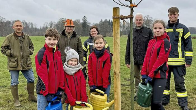 Verden-Eitze – Vor Ostern nutzte die Kinderfeuerwehr Eitze unter der Leitung von Yvonne Brune und Cedric Schwarze die „Dienststunden“ in den Osterferien, um gemeinsam mit der Kreisjägerschaft auf dem Wiesengrundstück des Jagdgenossen Frank-Peter Seemann im Hexenmoor bei Weitzmühlen vier Obstbäume zu pflanzen. Diese befinden sich in Sichtweite des von der Bingo-Umweltstiftung geförderten Wildbienenhotels, das im vergangenen Jahr vom Jagdpächter Mike Norden mit Unterstützung der Kinderfeuerwehr Weitzmühlen errichtet wurde.